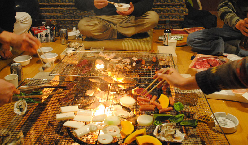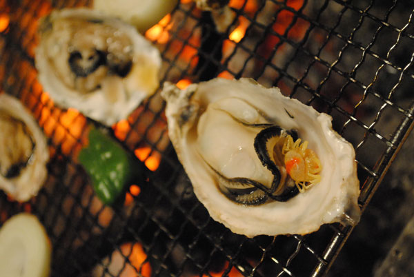 それぞれの仕事を終えた猟師たちが日暮れから集まり出し、炭火を囲って牡蠣BBQです。