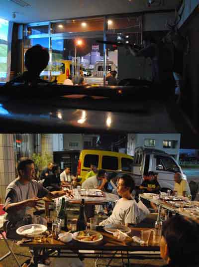お店の中でシミュレーターをして、外の駐車場ではビアーガーデンのような宴会で盛り上がりました。