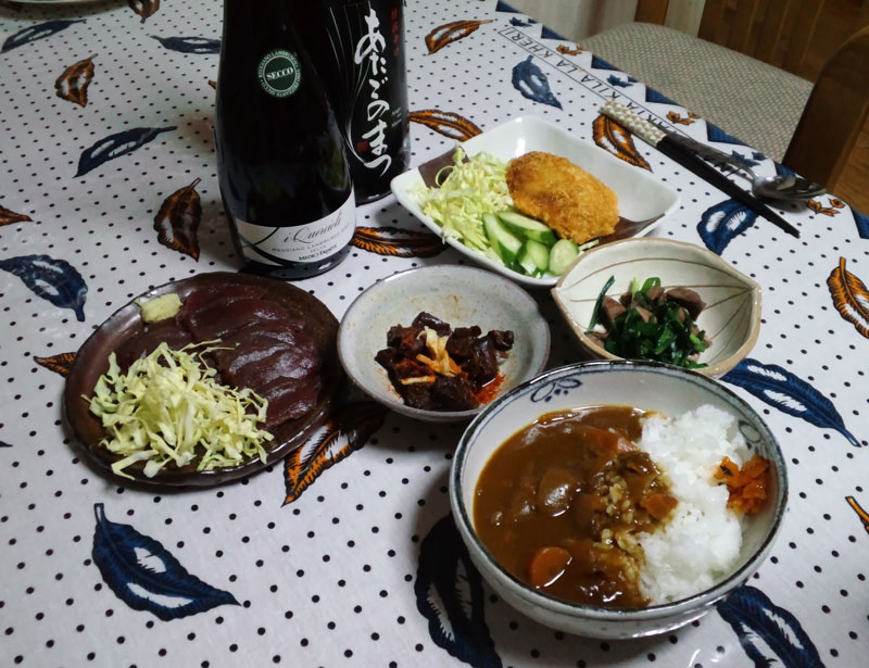 究極のシカ肉消費メニュー!!左から、シカ背ロースの刺し身、シカすじ肉の佃煮、シカコロッケ、鹿カレー、何でか?カモの砂ずりにら炒めも追加(^o^)肉代0円でも、処理の段階から考えるとめんどくさいし、これだけつくろうと思えば時間もガス代もかかる、お惣菜買ったほうが断然安いし脂肪分も多い・・・でも自分で獲った獲物を食す楽しみ、お酒との相性も普通のお肉ではない、ハーモニーを口の中でかもし出します?!特に甘みのある日本酒なんかは、肉の脂身があると酒の甘みと重なって口の中が甘ったるくなります。シカ肉なんかと合わせるとお酒の味が楽しめます!!本当は赤ワインなんかがいいお思いますが、最近はこれ「ランブルスコ セッコ」と言って赤ワインのスパークリング(^^ゞ少し甘みと渋みがあって、ビール代わりにごくごく飲めますよ!!皆さんどうですか!!ご希望でしたらシカ肉お分けしますよ・・・塊ですけど